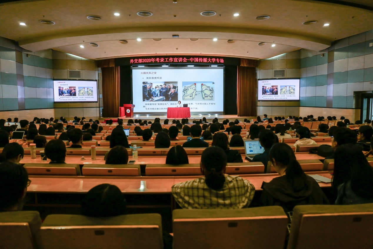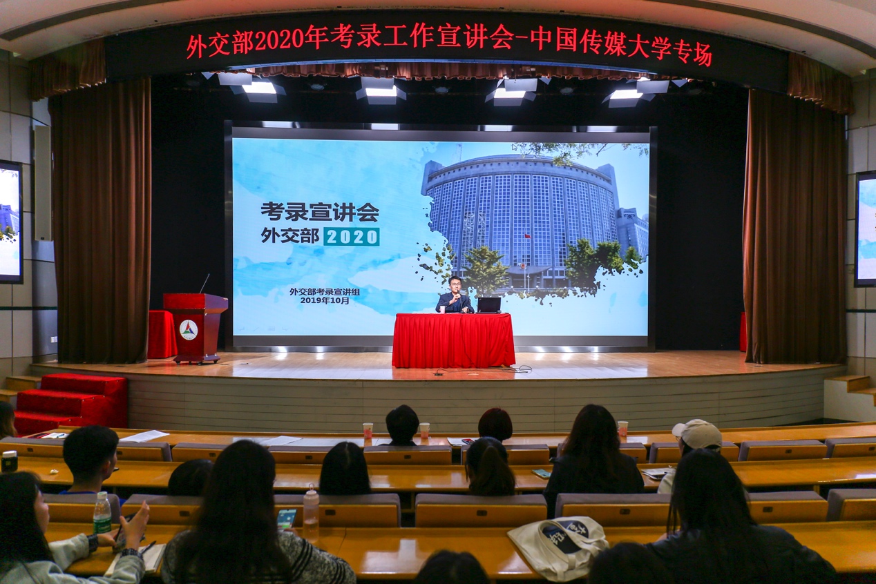 (通讯员 栾天天 郑玥)10月11日下午,“中华人民共和国外交部2020年考录工作宣讲会中国传媒大学专场”在我校综合实验楼中传讲堂举行。外交部新闻司参赞蒋小燕、军控司副处长来海洋、干部司考录培训处随员林浩来到现场,围绕我国外交工作、外交部公务员考录政策和外交官职业发展等内容进行宣讲,并与现场同学进行交流。