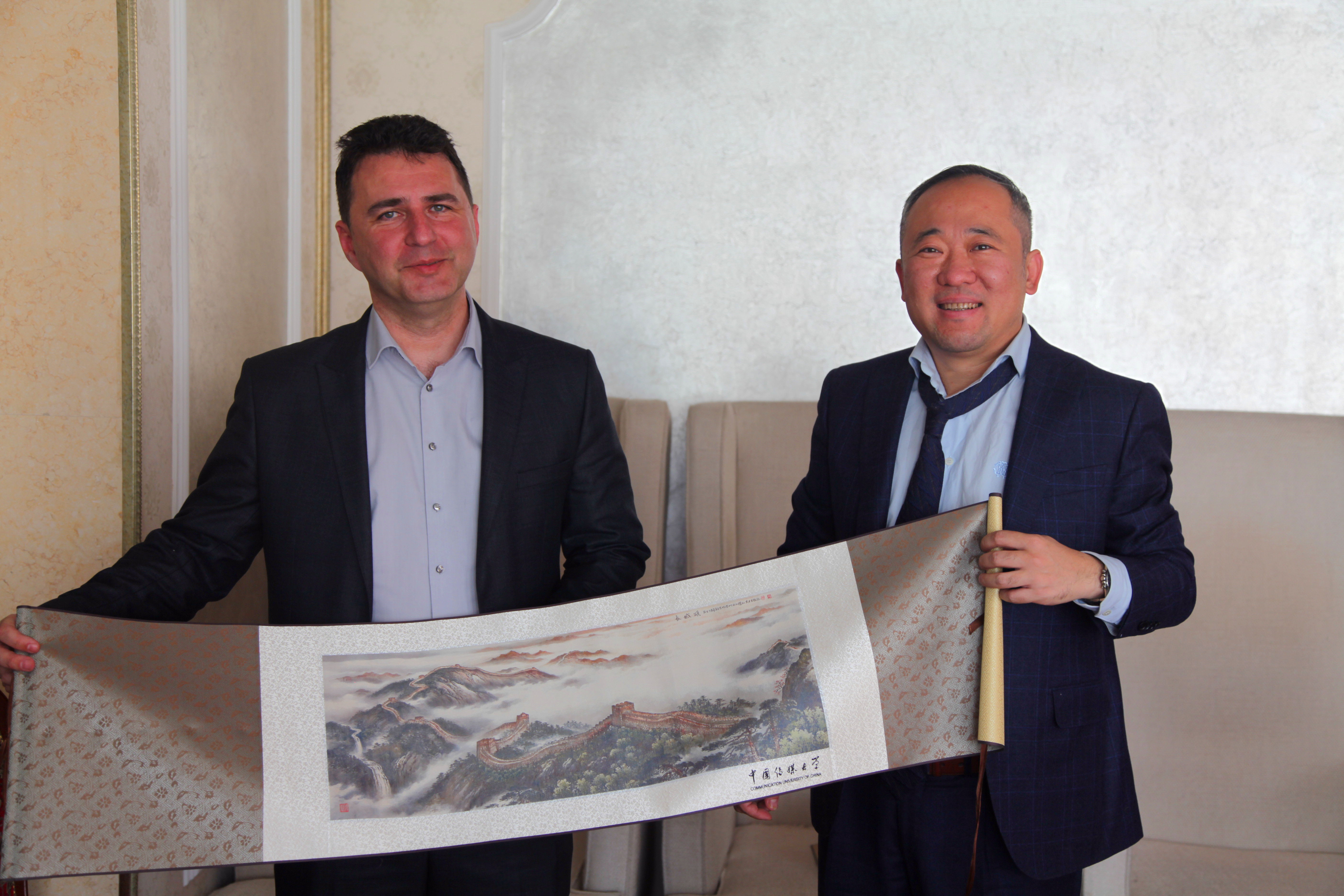 雅克西奇校长对我校刚刚成立的人类命运共同体研究院表示祝贺,并表示非常荣幸能够代表诺维萨德大学参加人类命运共同体揭牌活动。雅克西奇校长在向段鹏副校长介绍了塞尔维亚及诺维萨德大学的情况后,表明希望借助中国传媒大学丰富的研究中心实践经验与诺维萨德大学一起探索共同建设研究中心的可能性。