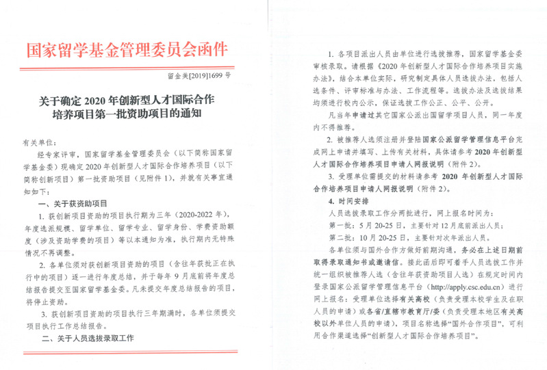 项目的资助期为三年(2020-2022),人员选拔录取工作将分两批进行,分别为2020年5月20-25日和10月20-25日,我校获得的年度资助指标包括博士生国际联合培养、访问学者、博士后师资,合作单位分别为美国密歇根州立大学、英国考文垂大学和诺丁汉特伦特大学。