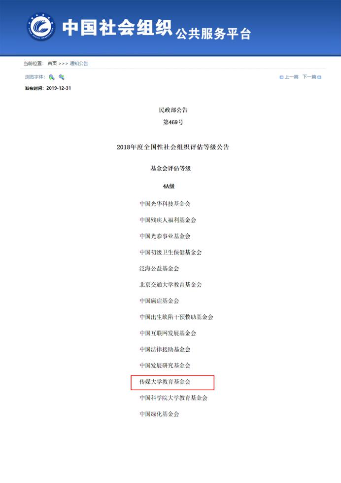 (通讯员 李岳峰)日前,民政部正式公布2018年度全国性社会组织评估等级结果,传媒大学教育基金会获评全国性4A级社会组织。