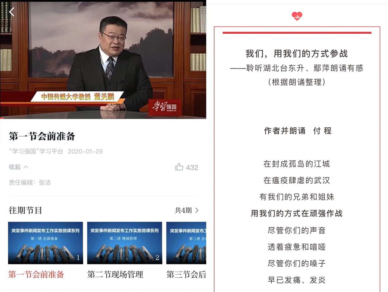 此外,我校一些教师也积极行动起来,通过课程录制、文艺创作等方式支持全社会疫情防控工作。如政府与公共事务学院院长董关鹏教授录制了四集“领导干部媒介素养高端课程之突发事件新闻发布实务微课”,上传到学习强国平台,提供给前方抗击疫情的领导干部学习参考;播音主持艺术学院退休教师付程教授创作并朗诵《我们,用我们的方式参战》诗歌,鼓舞前方抗击疫情等等,均取得了良好的社会反响。