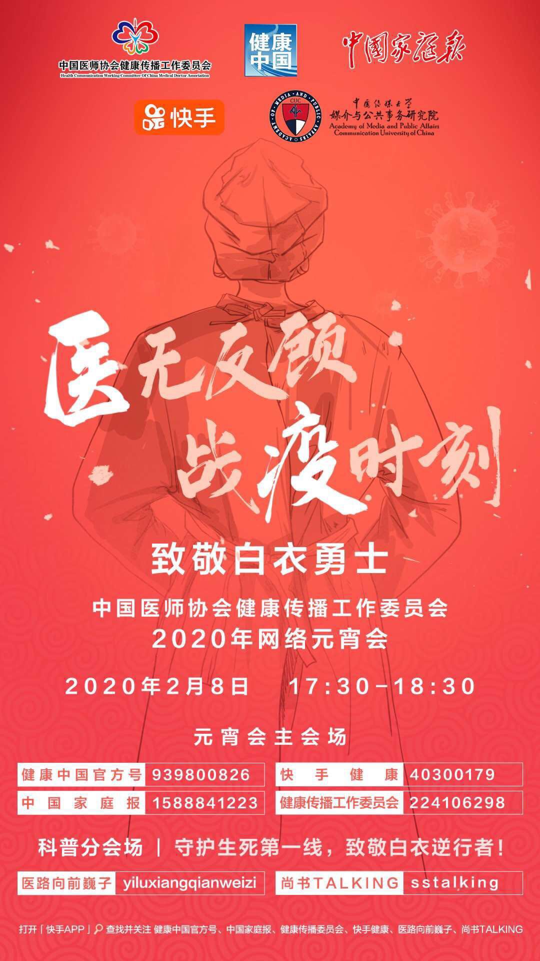 (通讯员 郐颖波)2月8日17点30分,我校媒介与公共事务研究院(挂靠政府与公共事务学院)联合中国医师协会健康传播工作委员会、“健康中国”新媒体平台、中国家庭报、快手、央视频,推出“‘医’无反顾、战‘疫’时刻,致敬白衣勇士”2020元宵节网络直播。