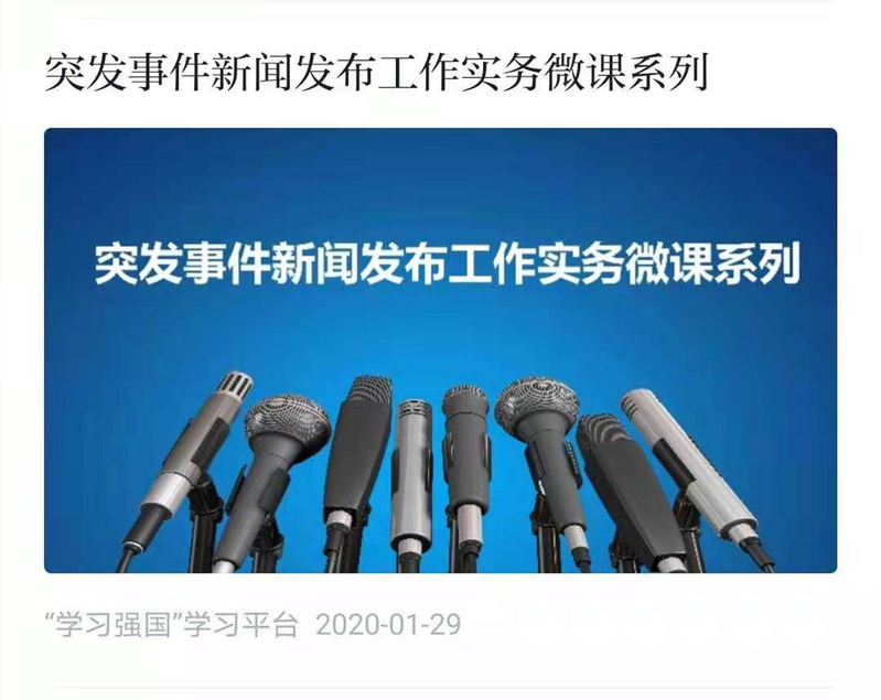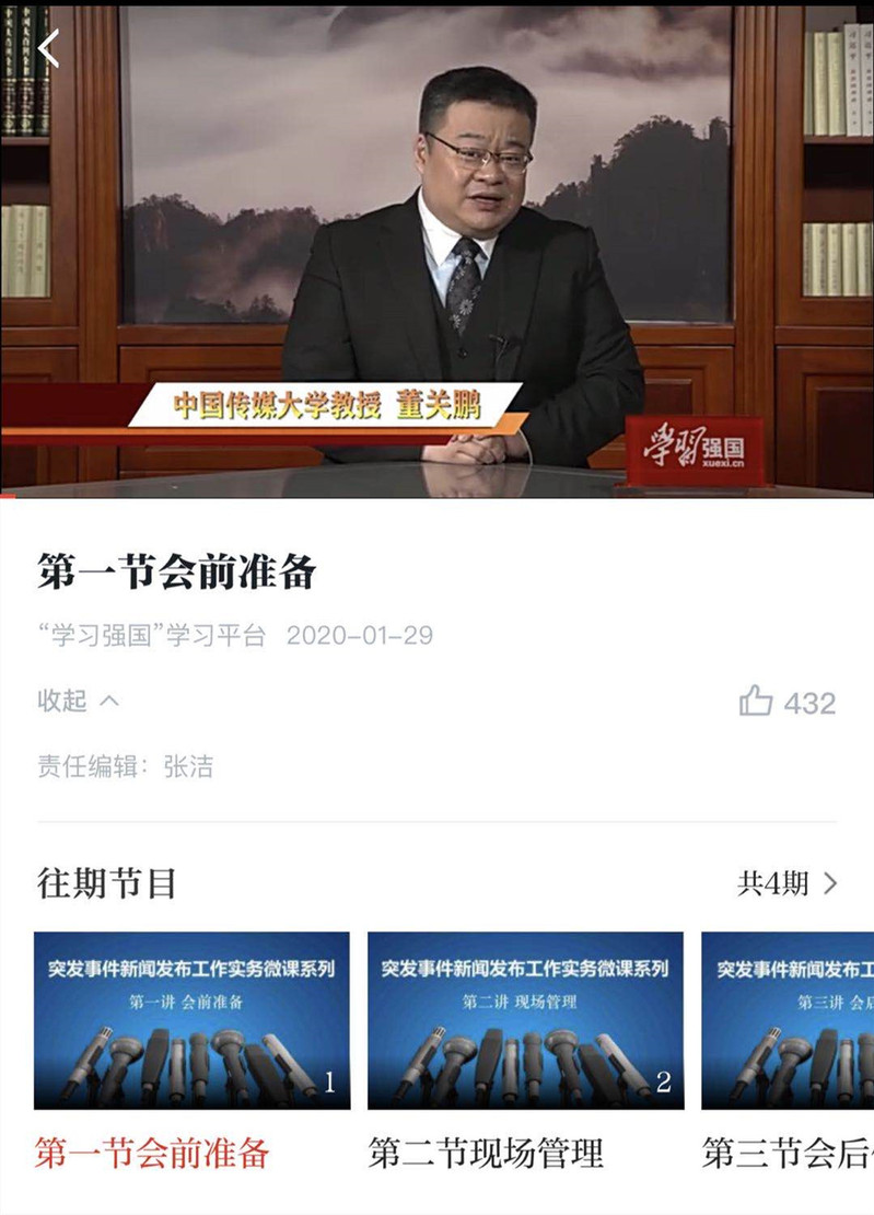 由于疫情形势日趋严峻,为了更好地指导各省区市围绕抗疫工作而进行的新闻发布工作,根据中央有关部门安排,董关鹏教授与“学习强国”相关团队于1月29日紧急录制了“突发事件新闻发布工作实务”系列微课。微课强调“直面问题、实事求是、充分准备、坦诚沟通”的十六字原则,紧紧围绕最常见的新闻发布会实务进行重点讲解。在短短的四十分钟里,涵盖“会前准备”“现场管理”“会后传播”“要点提示”四部分内容。该微课于当日夜间即在“学习强国”平台上线,得到中宣部、国新办等部委和部分省市抗疫一线单位的认可和欢迎。据了解,该微课在过去两周已成为颇受广大党员干部欢迎并积极学习的重要实务课程。