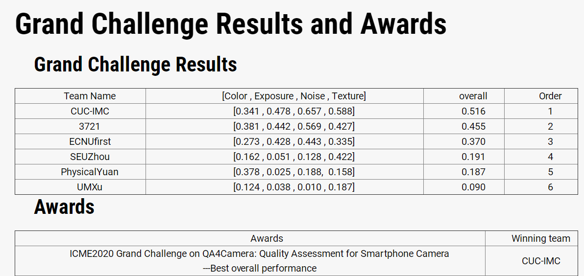 本次比赛的目的是对自然复杂场景下智能手机拍摄的图像质量开展评价研究,由于手机图像质量本身具有多种混合失真类型、受环境因素影响严重等问题,因此具有一定挑战性。参赛队伍需要从曝光、颜色、噪声和纹理等四种失真角度开展图像质量的综合评价,最终对15款智能手机拍摄的图像质量进行自动评分。信通学院IMC实验室以 “CUC-IMC” 队名报名比赛,团队原计划2月初返校参加比赛,但当时正值新冠肺炎疫情最严重的时期,无法成行。史萍教授根据实际情况,组织协调队员线上远程开展仿真实验工作。信通学院得知IMC实验室疫情期间参赛缺乏实验环境和仪器设备,主动与潘达老师对接,及时协调和提供学院实验资源,保障了队员们在家中顺利开展远程模型搭建和测试。值得一提的是,主力队员应泽峰博士在参赛期间身体不适,但怀着对科研的热爱,克服重重困难,最终完成模型设计并成功提交实验数据,以0.516综合得分获得第一名。这充分彰显了我校白杨精神,越是困难时期,越能克服严峻挑战,凝心聚力专注科研。