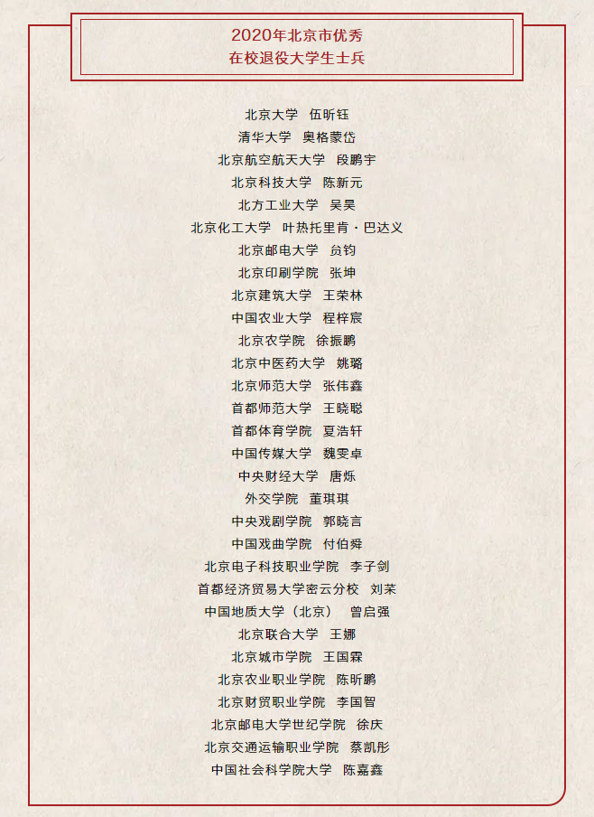 北京卫戍区司令部动员处副处长白斌、北京市教委高校学生处二级调研员孙世光、北京高校国防教育协会副理事长王洁生、北京高校国防教育协会秘书长许虎、副秘书长韩舰出席报告会,孙世光调研员宣读北京市人民政府征兵办公室、北京市教育委员会《关于表彰优秀在校退役大学生士兵的通报》,我校广告学院魏雯卓同学获得“2020年北京市优秀在校退役大学生士兵”荣誉称号。我校武装部组织2020年有参军意向的同学、广告学院部分学生代表共同观看。