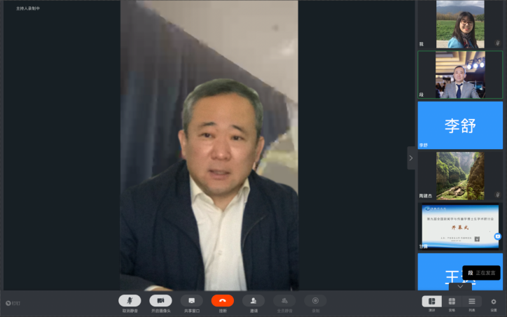 中国传媒大学副校长、博士生导师段鹏教授出席并代表主办方致辞。段鹏教授对参会的各位博士生表示热烈欢迎,充分肯定了本次研讨会在疫情特殊时期采用“云交流”“虚拟合影”的创新方式。他指出,相较于同类学术活动,“全国新闻学与传播学博士生学术研讨会”在主题上有着更强的包容性,也更注重凸显青年学术群体的活力与主体性。他号召青年学子们在追求学术的道路上,把习总书记“在学思践悟中坚定理想信念,在奋发有为中践行初心使命”的勉励落到实处,为国家的发展、民族的复兴做出这一代人应有的贡献。