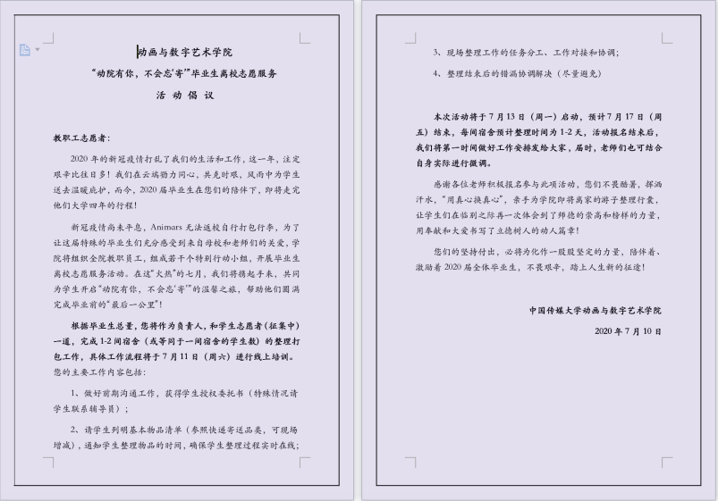 (通讯员 郭文琛)受新冠疫情的影响,2020届毕业生无法返校自行打包行李,为使2020届毕业生们圆满、顺利地完成各项毕业手续,动画与数字艺术学院开启毕业生离校志愿服务温馨之旅,在炎炎七月,用爱与信任,守护好毕业生的“最后一公里”。