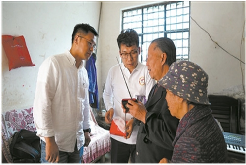 2019年9月25日,中国传媒大学电视学院党委书记曾祥敏(左一)携“光明影院”志愿者走进四川省凉山彝族自治州视障人士家中