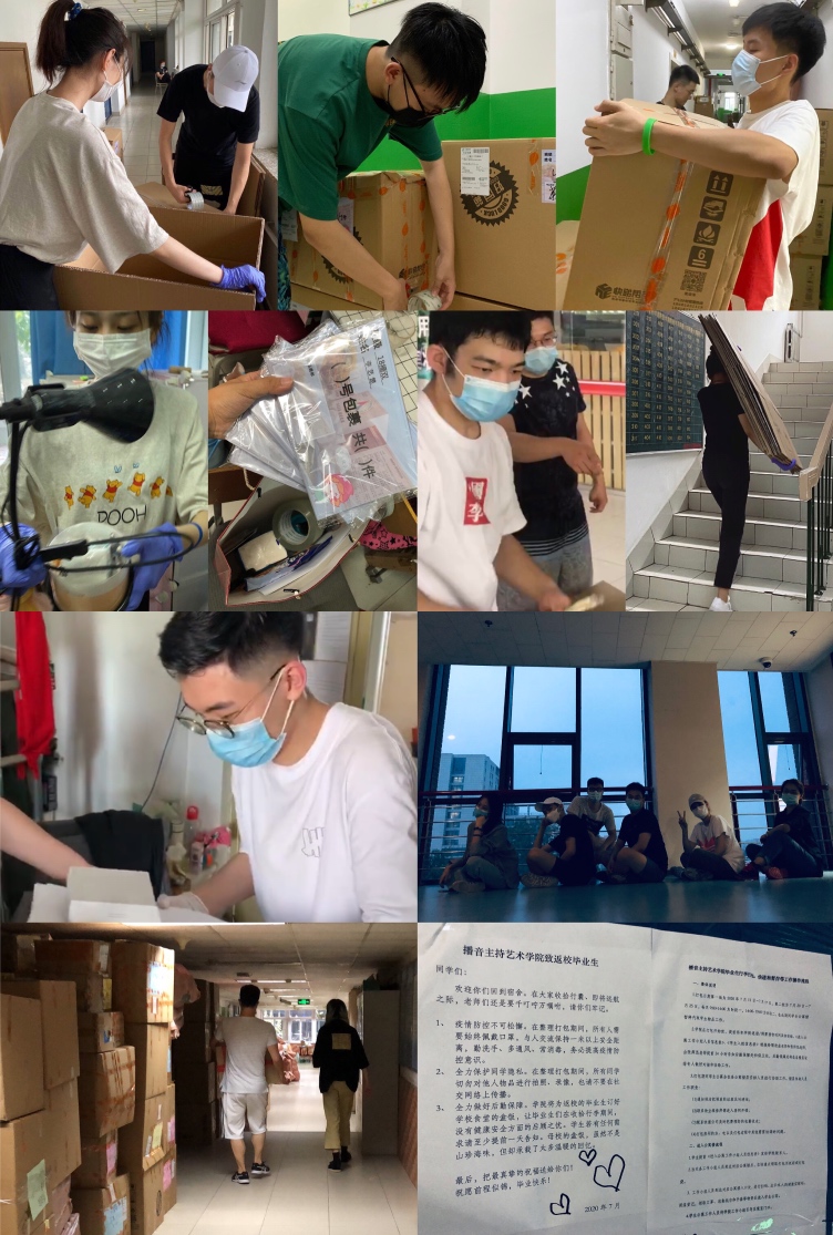7月12日至17日及24日,学院教师与学生志愿者共完成了52间宿舍共176名毕业生的行李打包工作。学院提前一对一与毕业生沟通整理时间、邮寄地址及相关细节安排,报备入校入公寓申请清单及行李整理工作表。在装箱过程中,老师、志愿者与毕业生们一一确认清点,及时沟通意见建议。学校后勤、保卫等职能部门全力支持,整个工作过程井然有序。实时视频相连促沟通的“小水滴”、准确表明归属和件数的定制款行李签、带有中传味道的暖心盒饭,使广大毕业生倍感温暖。