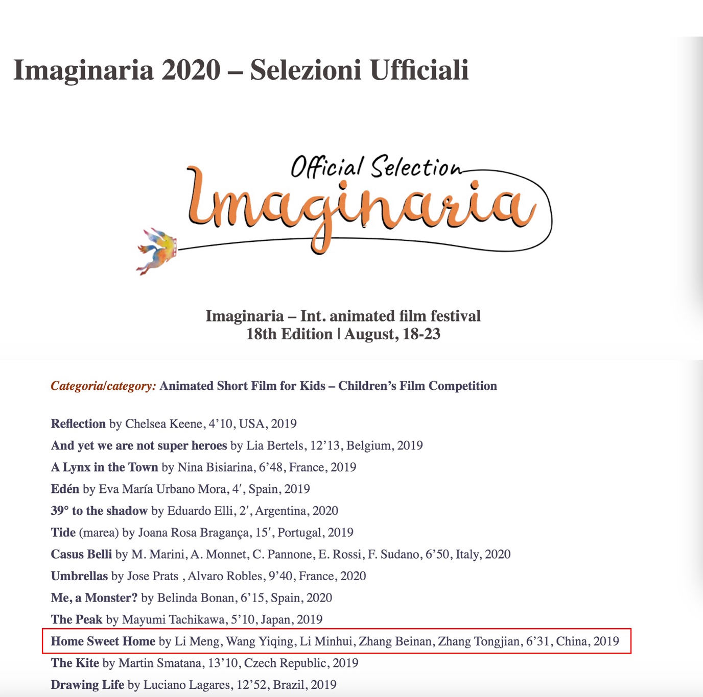 (通讯员 张若琦)日前,2020意大利Imaginaria国际动画节(Imaginaria–International Animated Film Festival)官网公布入围名单,我校动画与数字艺术学院2015级动画专业学生李萌、王一清、李民慧、张贝楠、张桐健的作品《窝窝》入围儿童短片竞赛单元,这也是入围本届节展唯一的一部中国作品。