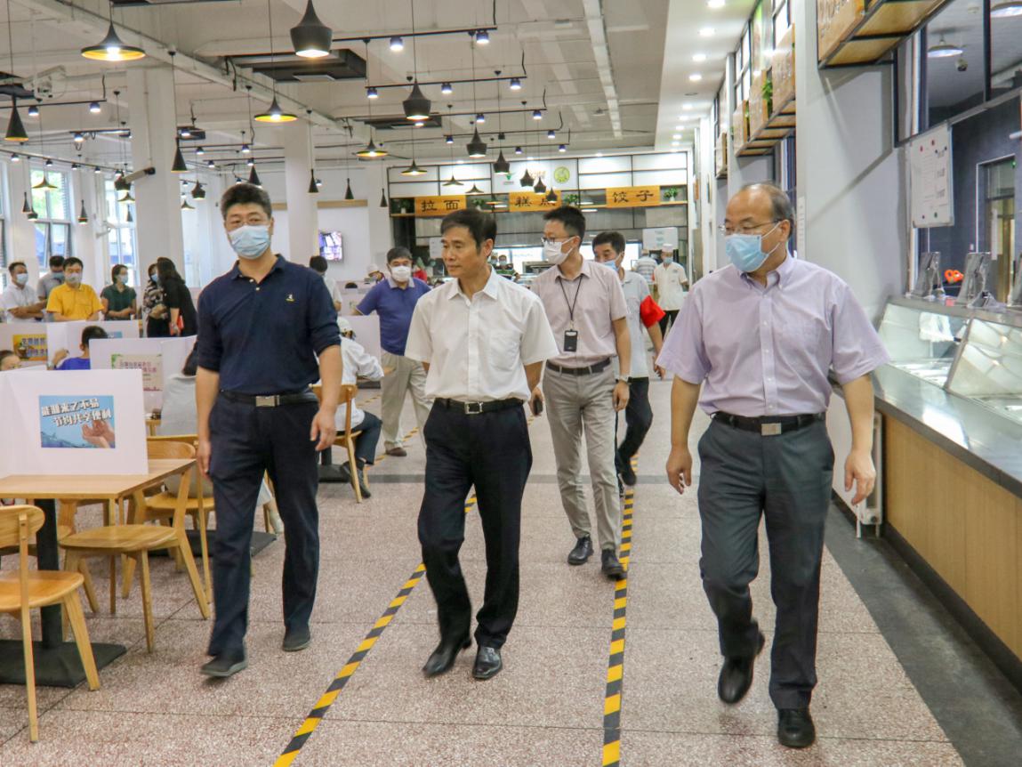 陈书记一行还来到中蓝学生公寓,看望刚刚返校的同学们,了解他们居家学习生活情况,勉励大家在新学期继续努力,学习提高。在北苑餐厅,陈书记详细查看了体温检测、1米间隔线、出入二维码、餐桌隔板、消毒用品等设置配备情况。陈书记强调,要严格执行食堂、宿舍的卫生消杀和疫情防控规定,做好服务保障工作,确保食品安全和宿舍区卫生,保障良好的生活环境。