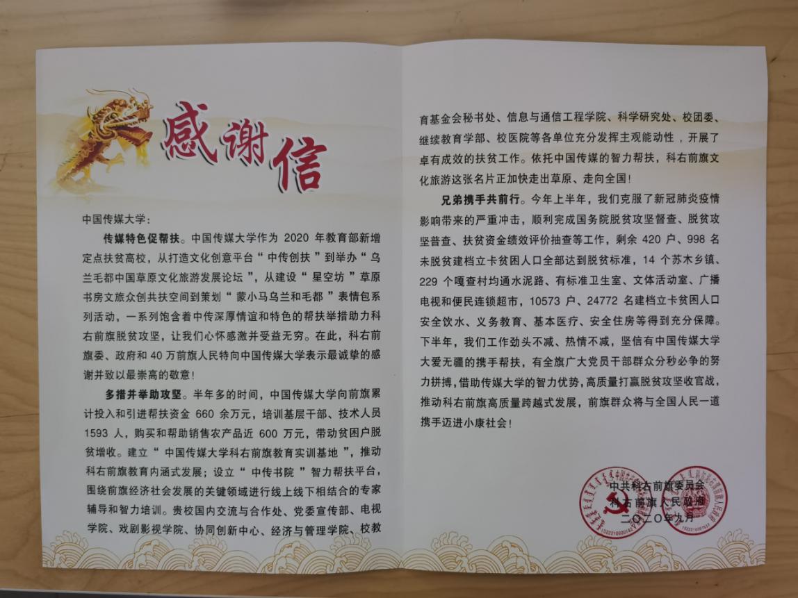 按照教育部党组的部署安排,作为2020年新增的定点扶贫高校,中国传媒大学扎实推进帮扶工作,上下联动,举全校之力抓紧抓实抓细各项扶贫任务,助力内蒙古科右前旗“脱贫攻坚”,在超额完成各项扶贫任务的基础上,继续深化各项帮扶工作。