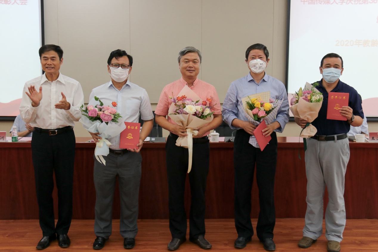 4位教师代表依次发言,分享教学成果与心得,畅谈教学体会和感悟。2020年教龄满30年教职工代表、戏剧影视学院黄金华老师深情回忆了30年来在校执教、工作、生活的点点滴滴,回顾了自己“做一个好老师”的初心,认为做一个好老师,最根本的是要有对学生负责的一份责任心。他表示,中青年教师队伍中,对学生有责任心,专业素养又高,视野开阔,理论与实践结合能力强的,大有人在,希望他们为学校未来改革发展作出更大贡献。