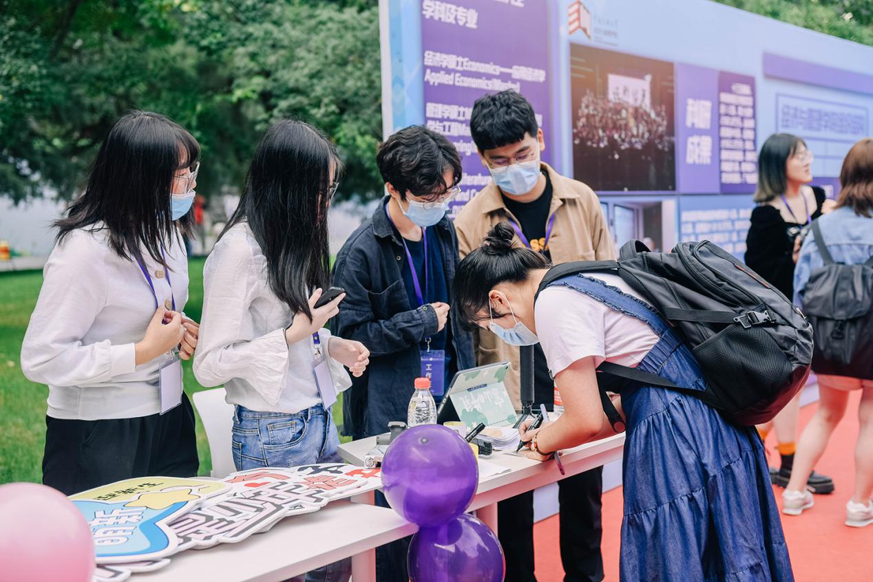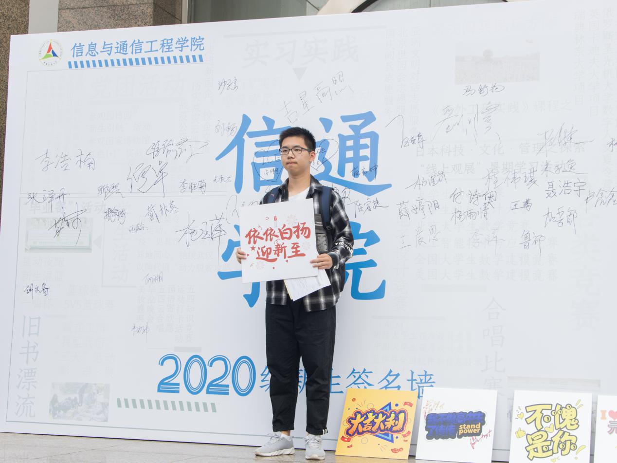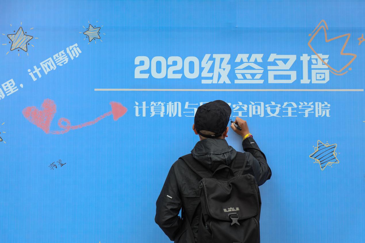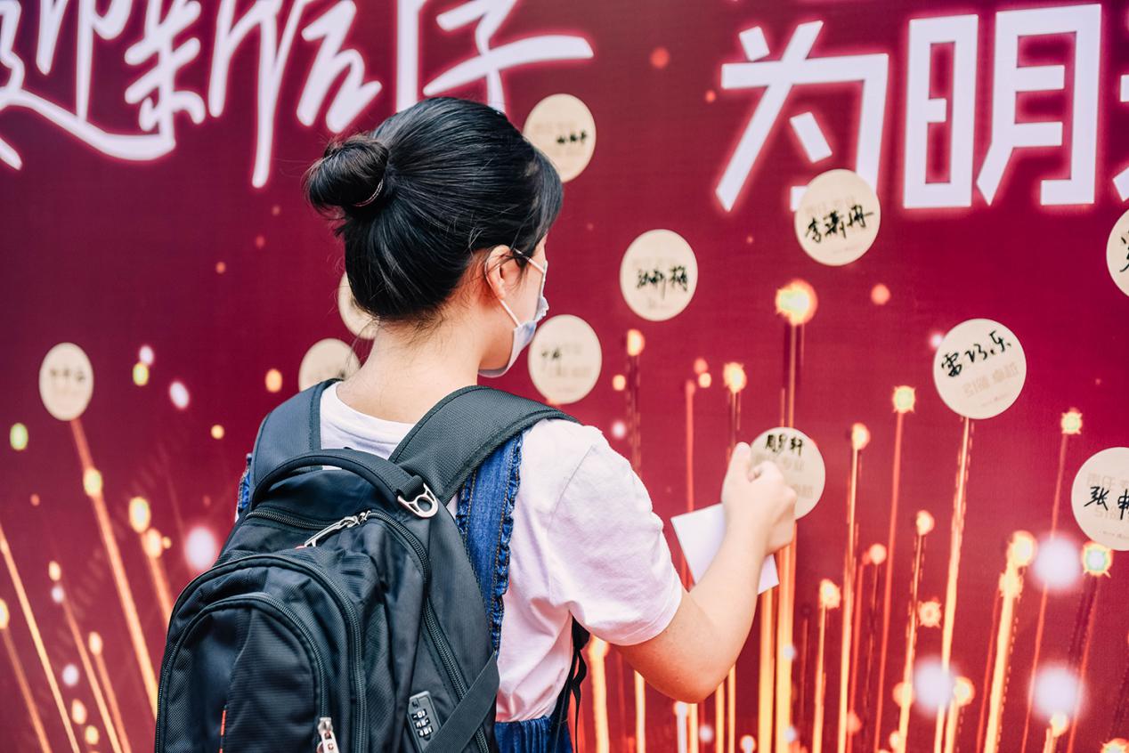 经济与管理学院的新生们穿过五彩的气球拱门,踏上华丽的红毯,在贴纸上郑重签下自己的名字,并在火红的展板上点缀成簇簇星火。