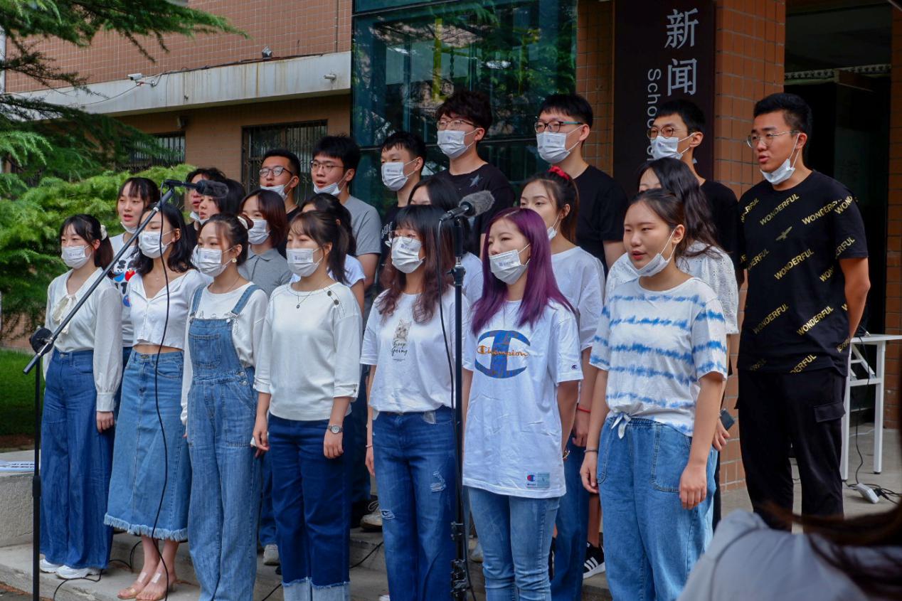 新闻学院白杨合唱团现场献唱校歌《校园里有一排年轻的白杨》,欢迎第一批报到的新生。新生们还会领取带有新闻学院Logo的防疫口罩和学院徽章。