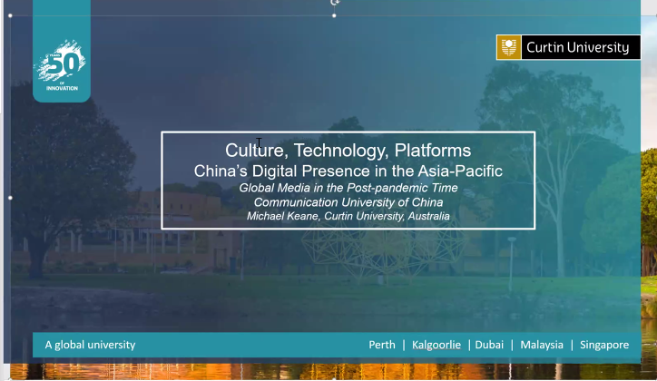 澳大利亚科廷大学Michael Keane教授的主题演讲围绕《文化、技术、平台:中国在亚太地区的数字存在》展开。后疫情时代下,“线上”已然成为了一种“新常态”。数字文明的逐步生成、文化的产生变成了一种悬空的沉积过程。通过对“数字中国——从文化存在到创新国家2017-2020”的研究,希望能够解答关于中国能否借力互联网的“数字力量”一跃成为国际公认的创新型国家和中国文化“走出去”的有效性究竟如何这两个问题。该研究发现,亚太地区与澳大利亚五个地区民众对中国的认知并不相同、了解程度也存在差异,这可能与媒体煽动、极端偏见与文化过滤的泡沫有关。