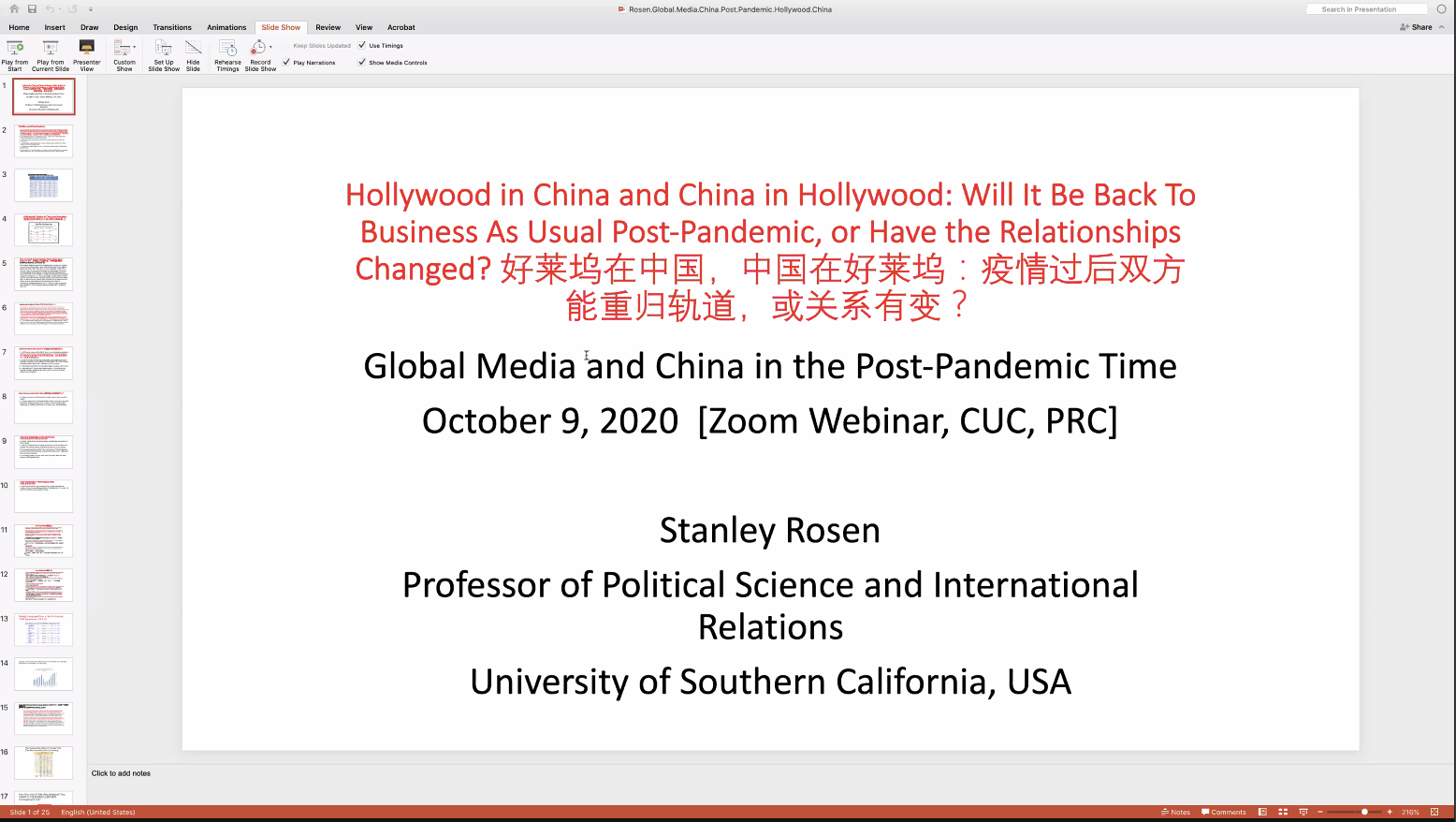 美国南加州大学Stanley Rosen教授围绕《好莱坞在中国、中国在好莱坞:疫情过后双方能重归轨道或关系有变?》主题进行了精彩演讲。2020年新冠疫情席卷全球加速造成了中国与好莱坞的分道扬镳之势。好莱坞在中国的市场占有率迅速下降,与此同时中国也开始大力进行本土电影创作。但诸多问题也导致中国创作的电影难以融入国际市场。疫情为中国本土电影创作者带来了机会,但如何展现中国特色、讲好中国故事,与好莱坞“大片”势均力敌、相互角逐还是任重而道远。