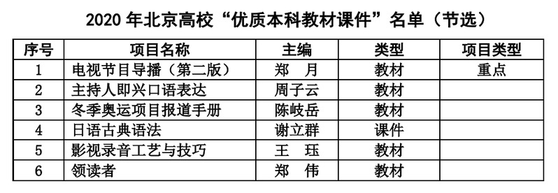(通讯员 蔡开松)日前,北京市教委公布了2020年北京高校“优质本科课程”和“优质本科教材课件”名单,由中国传媒大学出版社出版的5种教材及1个课件入选了“优质本科教材课件”名单。