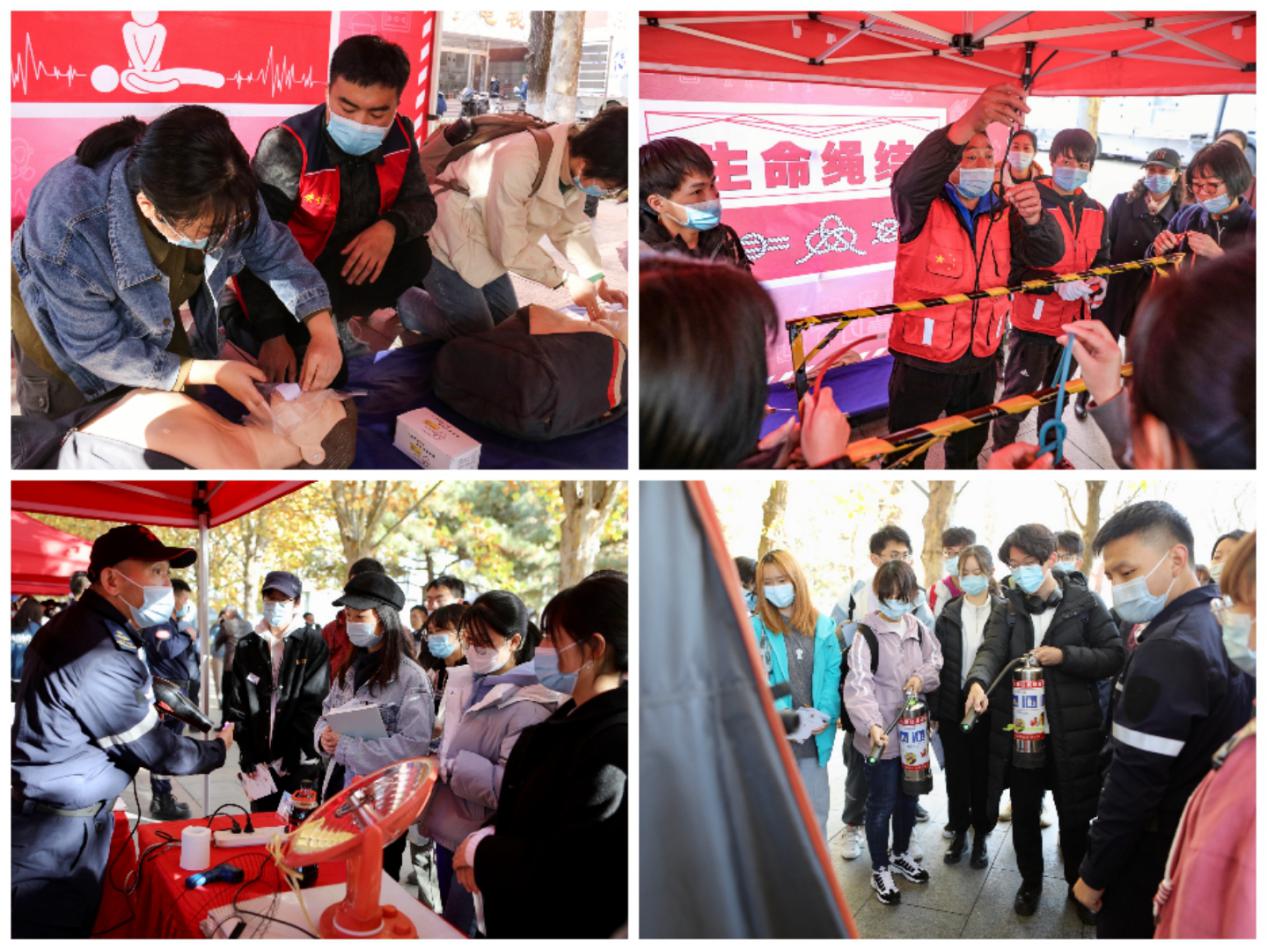 活动现场设有“心肺复苏示范培训区”“生命绳结教学区”“灭火体验区”“烟热逃生体验区”“消防隐患实验室”5个消防体验区,参加培训的师生在教员的指导下,通过体验、学习,掌握灭火、逃生等方法,了解规避消防隐患的小知识。