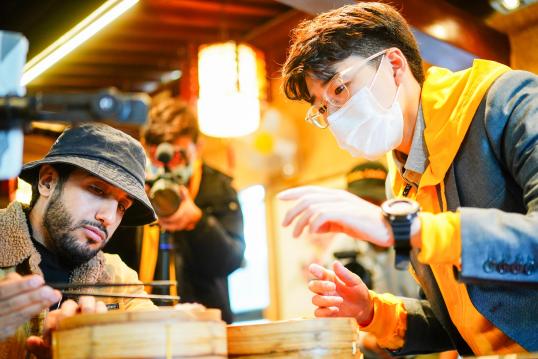 由戏剧影视学院本科留学生同学组成的留学生联队则前往东城区著名旅游景点和美食街区鲜鱼口进行拍摄,以外国人的视角展开对中华传统美食文化的品鉴,创作出时长7分钟的《道味中国》,利用舞蹈、说唱、直播等新潮形式切入美食主题,传递文化交融互通的精神与中华美食文化的气派。