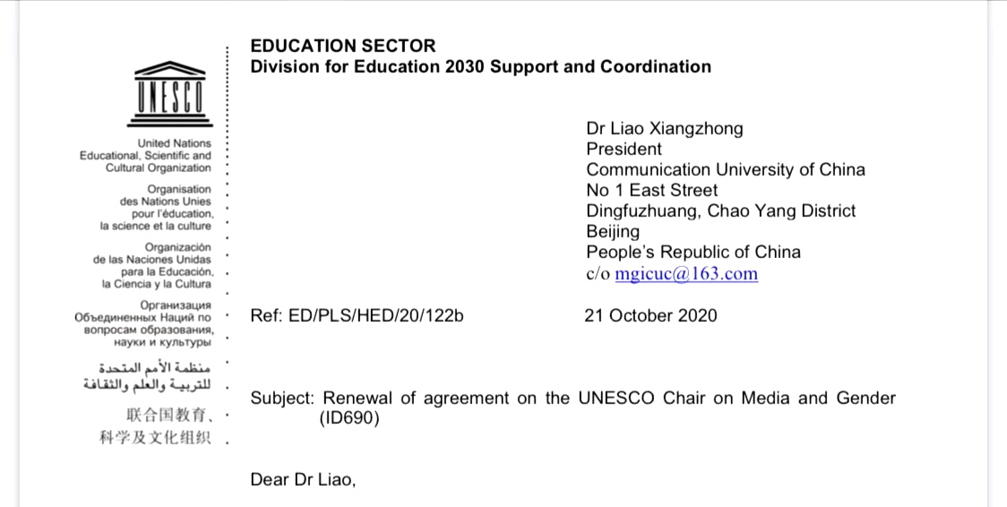 联合国教科文组织高等教育部门主任彼得·威尔斯先生给校党委书记、校长廖祥忠发来公函,感谢中国传媒大学对教席工作的大力支持,对过去的4年间,“媒介与女性”教席在研究领域、教学领域、培训领域以及国际合作领域等方面取得的丰富成果给予了高度评价。他指出,教席圆满实现了教席协议中规定的工作目标,包括承担以中国妇女状况为主题的国家研究项目、翻译联合国教科文组织出版物,以及开展国家人才培养基地项目——“一带一路”杰出女性领导力培训课程等。此外,威尔斯先生还肯定了教席提交的2019-2023年活动计划中“加强与教科文组织合作,开展高质量的科研及培训,以改善妇女发展的媒体生态”内容,期待与教席开展进一步合作。