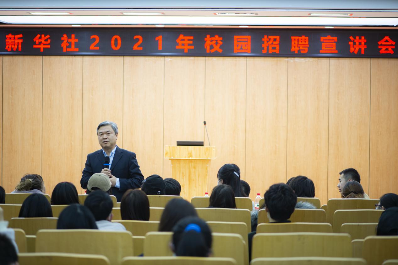 (通讯员 吴倩倩 摄影 陈逸飞 涂陈昊)11月22日下午3点,新华社2021年校园招聘宣讲会在我校44号楼一层报告厅顺利举行。新华社副秘书长、人事局局长景如月,音视频部主任孙志平,总编室全媒编辑中心副主任钱彤等一行8位宣讲嘉宾来到现场,向我校毕业生介绍新华社的发展现况及考录要求,并分享了在新闻一线工作的收获与感想。我校党委书记、校长廖祥忠,党委副书记姜绪范出席宣讲会,并与新华社宣讲嘉宾座谈。
