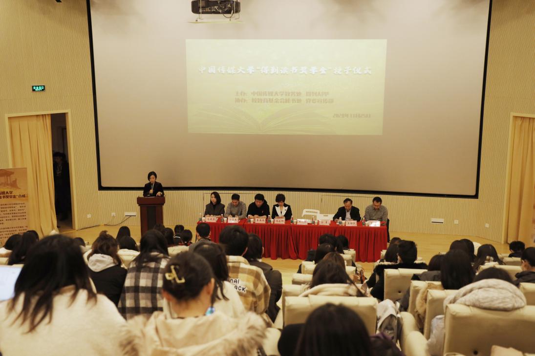 (通讯员 宋文微 马如玥 摄影 王雷亭 马旭隆 张思源)11月25日下午,首届中国传媒大学“得到读书奖学金”颁奖典礼暨中传“悦读”读书分享会在广告博物馆一层报告厅成功举办。奖学金捐赠方代表得到APP副总裁冯启娜,学校教务处处长王晓红,教育基金会秘书处秘书长、校友工作办公室主任金勇,党委宣传部副部长、融媒体中心副主任王维家,实验室与设备管理处副处长、教务处副处长李燕荣出席。活动由教务处办公室主任宁晶晶主持,全体获奖学生及各学院学生代表参加活动。