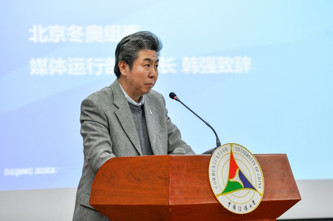 韩强副部长代表北京冬奥组委发言。他谈到,中国传媒大学作为中国传媒领域的“黄埔军校”,是广播电视行业的翘楚,在奥运会电视转播工作中有优良的传统和丰富的经验。他希望广大的中传学子能抓住参与北京2022年冬奥会这样“一生一次,不可多得”的机会,做好学习和工作上的充分准备。他同时代表北京冬奥组委向中国传媒大学对北京2022年冬奥会BTP转播培训项目的支持表示感谢,也预祝此次项目合作顺利。