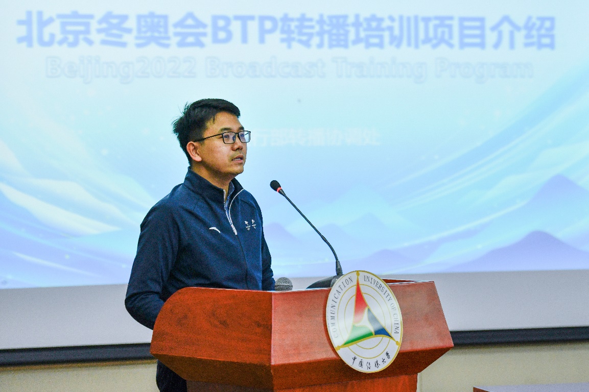 随后,北京冬奥组委媒体运行部转播协调处高博处长就北京2022年冬奥会BTP转播培训项目作了宣讲。高博处长从奥运电视转播简史及概况入手,通过短片等方式介绍了冬奥会场地、BTP转播培训项目选拔计划、中国传媒大学岗位分配、BTP项目招募流程等。