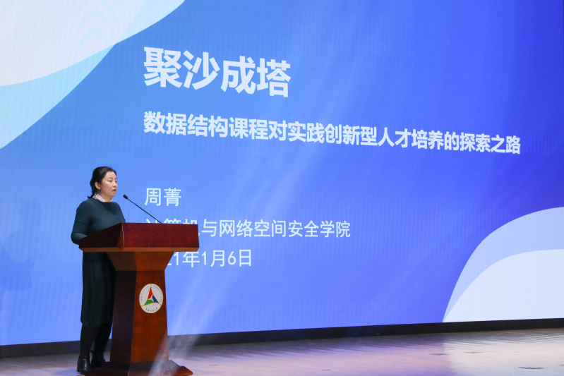 计算机与网络空间安全学院周菁教授围绕《数据结构》课程的改革,认为工科课程应该提高课程建设的开放性,充分利用社会资源为教学服务、为建设特色专业服务,通过开放性的课程建设了解产业需求、准确定位人才培养目标、拓展学生知识面。同时,要注意改进课程的设计方法,藏巧于拙,让新工科与老工科专业有机融合,鼓励学科交叉融合,取长补短互相渗透,打造新型的课程体系。