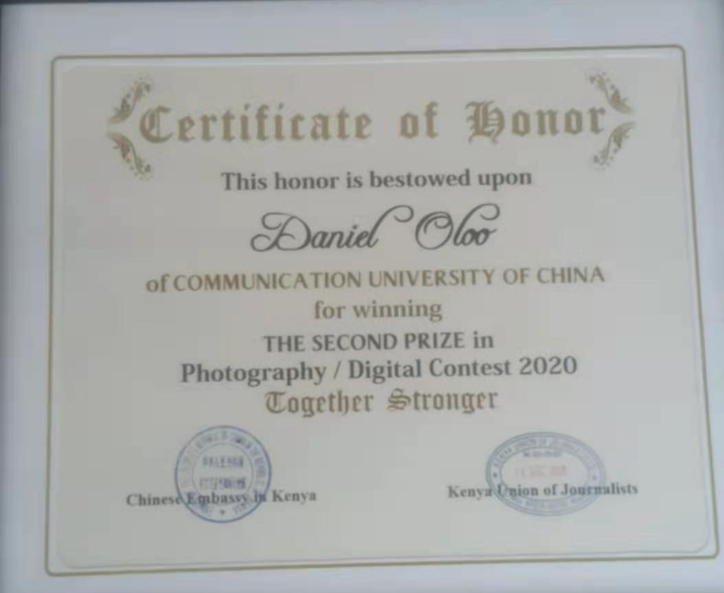 (通讯员 彭聪)2020年10月,在纪念联合国大会成立75周年之际,中国驻肯尼亚大使馆和肯尼亚新闻工作者联合会(KUJ)启动了以“在一起,更强”("Together, Stronger")为主题的摄影/数字艺术大赛,旨在增进世界文明的交流与合作。在于日前公布的获奖名单中,我校传播研究院博士留学生Daniel Oloo凭借基于他在中国生活与西南边陲体验创作的专业视频作品荣获二等奖。