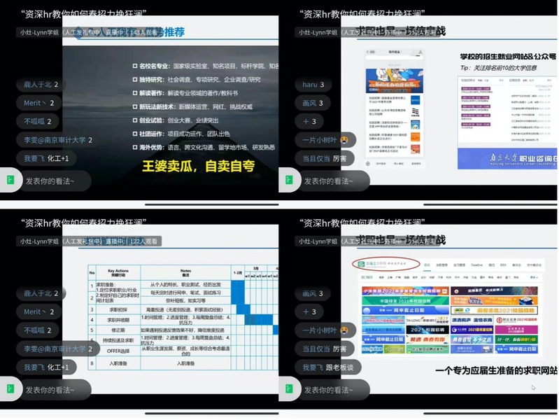 本次特训营特邀四位导师直播讲授求职攻略。从求职思路、简历制作、笔面试技巧等多方面提供专业指导,同时在微信群中开展群面技巧、薪资问题的讨论,参与学习人数达到168人。此外,特训营还提供了全面、及时的就业与实习信息,助力毕业生春招求职之路。