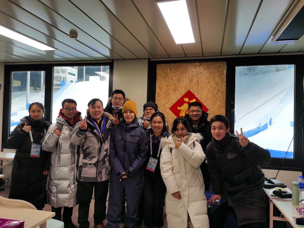 大年初二、初五,我校播音学子分两批抵达张家口,前往云顶滑雪公园、国家越野滑雪中心、国家跳台滑雪中心、国家冬季两项中心开展工作。在云顶滑雪公园首赛场馆,我校学生钟瑞奇、吕嵩妍、李润青、李健、刘思辰、王铎睿、庞博放弃了与家人共度春节的机会,投入到了紧张的工作中,展示出良好的专业素养和语言能力。其中,面对多语种播报挑战,刘思辰同学运用法语和英语进行现场播报,为云顶滑雪公园体育展示工作增添了一抹亮色。