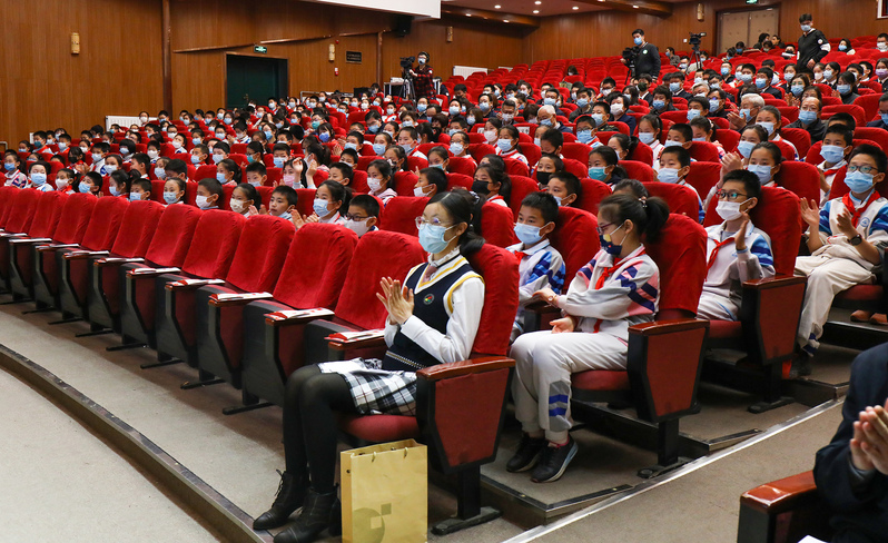 杨利伟副总设计师在现场分享了遨游太空的经历,并就同学们关心的问题进行现场互动。他还和李宏塔副主席一起,向师生代表赠送了“百年先锋”签名折页。