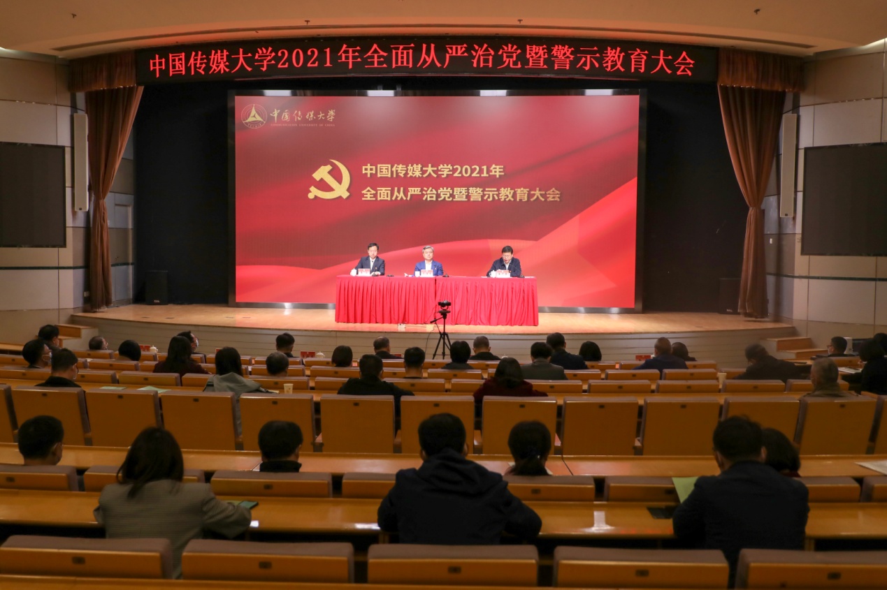 (通讯员 郇瓛 摄影 王雷亭 王开悦)4月14日下午,中国传媒大学组织召开2021年全面从严治党暨警示教育大会,深入学习贯彻党的十九届五中全会、十九届中央纪委五次全会、市纪委十二届六次全会、教育部2021年全面从严治党工作视频会议、市委教育工委2021年全面从严治党工作会议暨警示教育大会精神,总结2020年学校全面从严治党工作,分析研判形势,部署安排2021年工作,开展警示教育。党委副书记、纪委书记王达品传达了上级有关会议精神,对2021年学校纪检监察工作提出要求。党委书记、校长廖祥忠发表重要讲话。党委副书记李众主持会议。