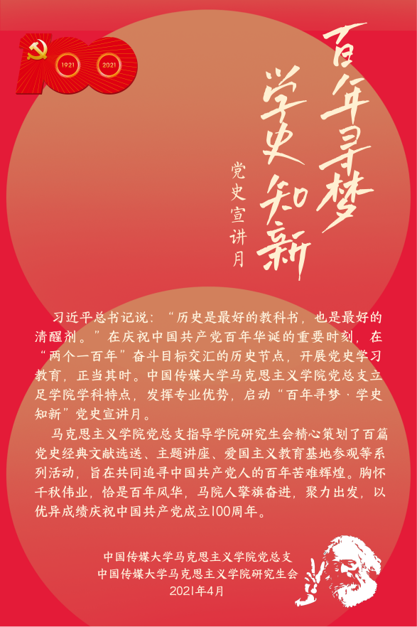 (通讯员 唐牧遥 王博)一年之计在于春,党史学习正当时。2021年4月,为贯彻落实中国传媒大学党史学习教育安排,马克思主义学院党总支立足学科特点,发挥专业优势,正式启动“百年寻梦·学史知新”党史宣讲月活动。