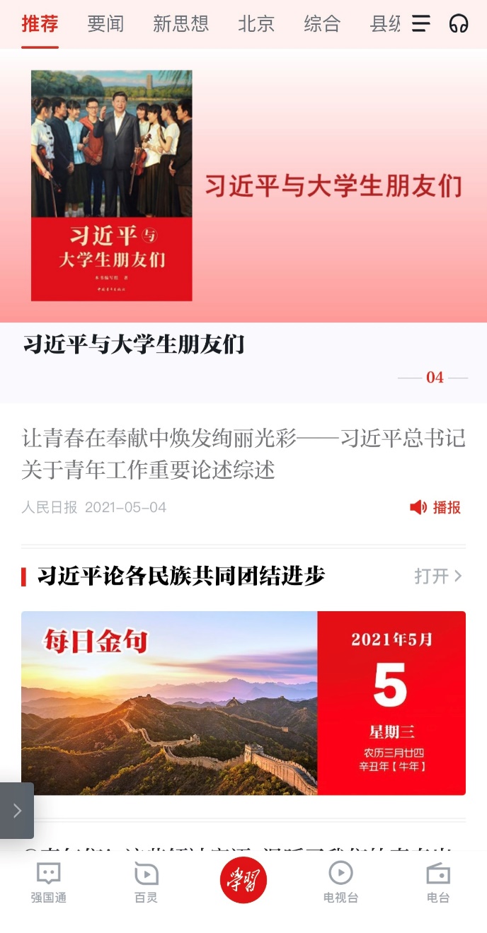 在“五四”青年节到来之际,由中国传媒大学播音主持艺术学院、音乐与录音艺术学院师生联合制作的有声书《习近平与大学生朋友们》在中宣部“学习强国”平台推荐频道首页上线轮播,并在“强国之声——大学生朗读”频道正式推出。