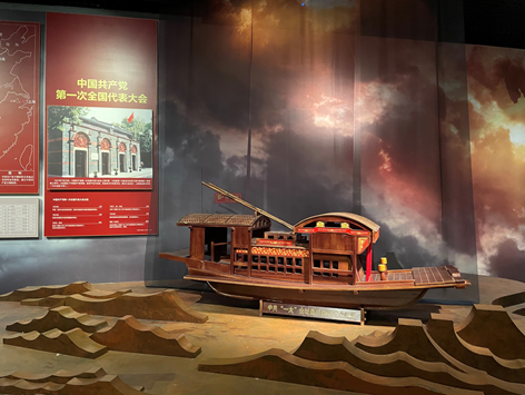 穿过仿建的上海石库门,一艘木质红船映入眼帘。1921年7月23日,中国共产党第一次全国代表大会在上海开幕,最后一天的会议转移到浙江嘉兴南湖的游船举行,会议宣告了中国共产党正式成立。从嘉兴南湖起航的小小红船到乘风破浪的巍巍巨轮,它承载了人民的重托、民族的希望,它驶入历史的波涛壮阔,领航中国行稳致远。