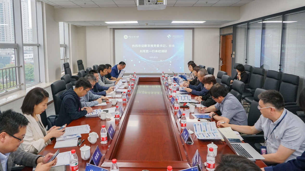 (摄影 肖晓蓉 沈璐)5月13日上午,新京报社党委书记、社长刘军胜一行来到中传,就推进双方先前签署的战略合作协议中的科研合作对我校媒体融合与传播国家重点实验室展开调研,受到我校党委书记、校长廖祥忠的热情接待。