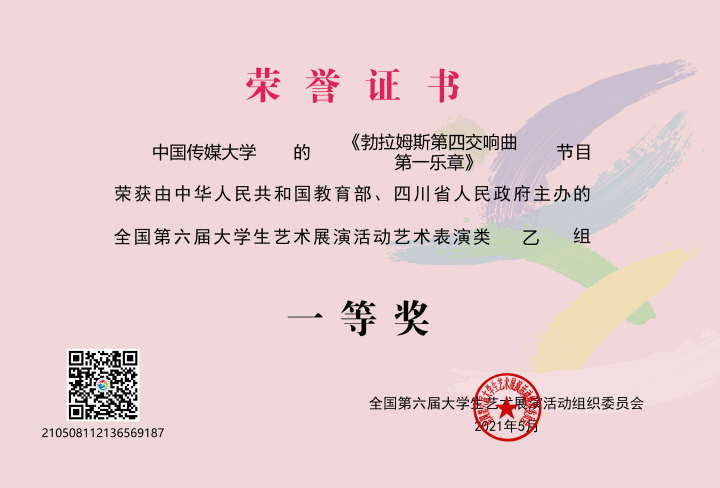 (通讯员 吉也)5月6日,全国第六届大学生艺术展演在四川成都开幕,我校交响乐团代表北京市参加了展演活动,喜获艺术表演类乙组(专业组)一等奖的好成绩。音乐与录音艺术学院院长李俊梅教授、副院长兼艺术教育中心主任俞锫教授,艺术教育中心李巍、解阗瑞老师率团参展。