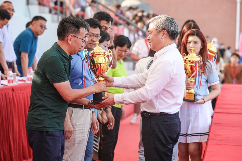 党委书记、校长廖祥忠为教职工团体总分前六名获得单位颁发奖牌。