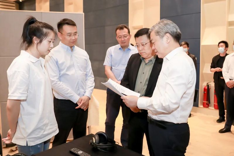 王灏书记首先来到电视学院“光明影院”展示厅,观看“光明影院”项目三年来的工作成果,听取项目开展情况介绍,查看无障碍电影制作工作区,了解无障碍电影制作工序,并与正在工作的同学们亲切交谈。他还饶有兴致地带上眼罩,同廖祥忠书记一起,通过声音体验师生团队制作的无障碍电影片段。