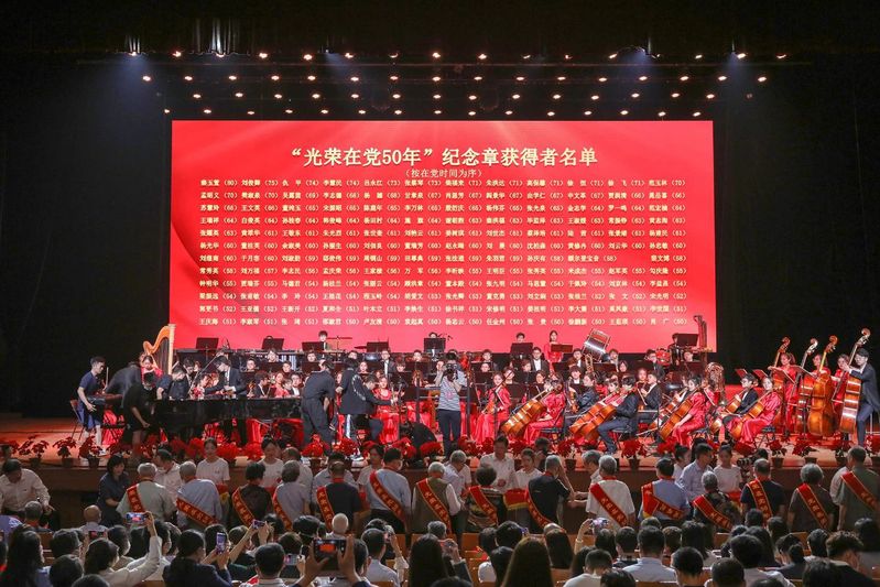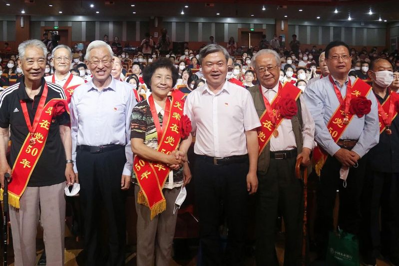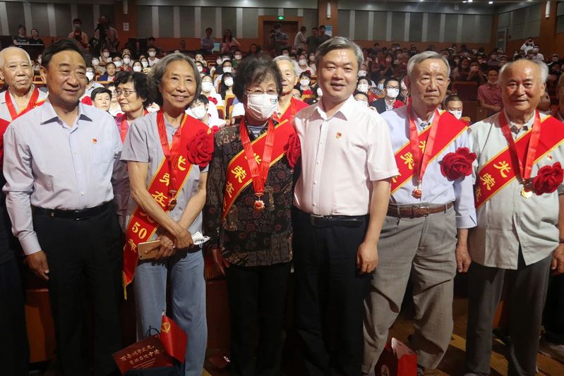 党委副书记、纪委书记王达品宣读表彰决定,并致“光荣在党50年”纪念章颁发辞。廖祥忠书记,杨学义组长,翟志席联络员及校领导、党委常委、校长助理,分别为先进党组织、优秀共产党员、优秀党务工作者受表彰代表颁奖,并为28名老党员代表颁发“光荣在党50年”纪念章。