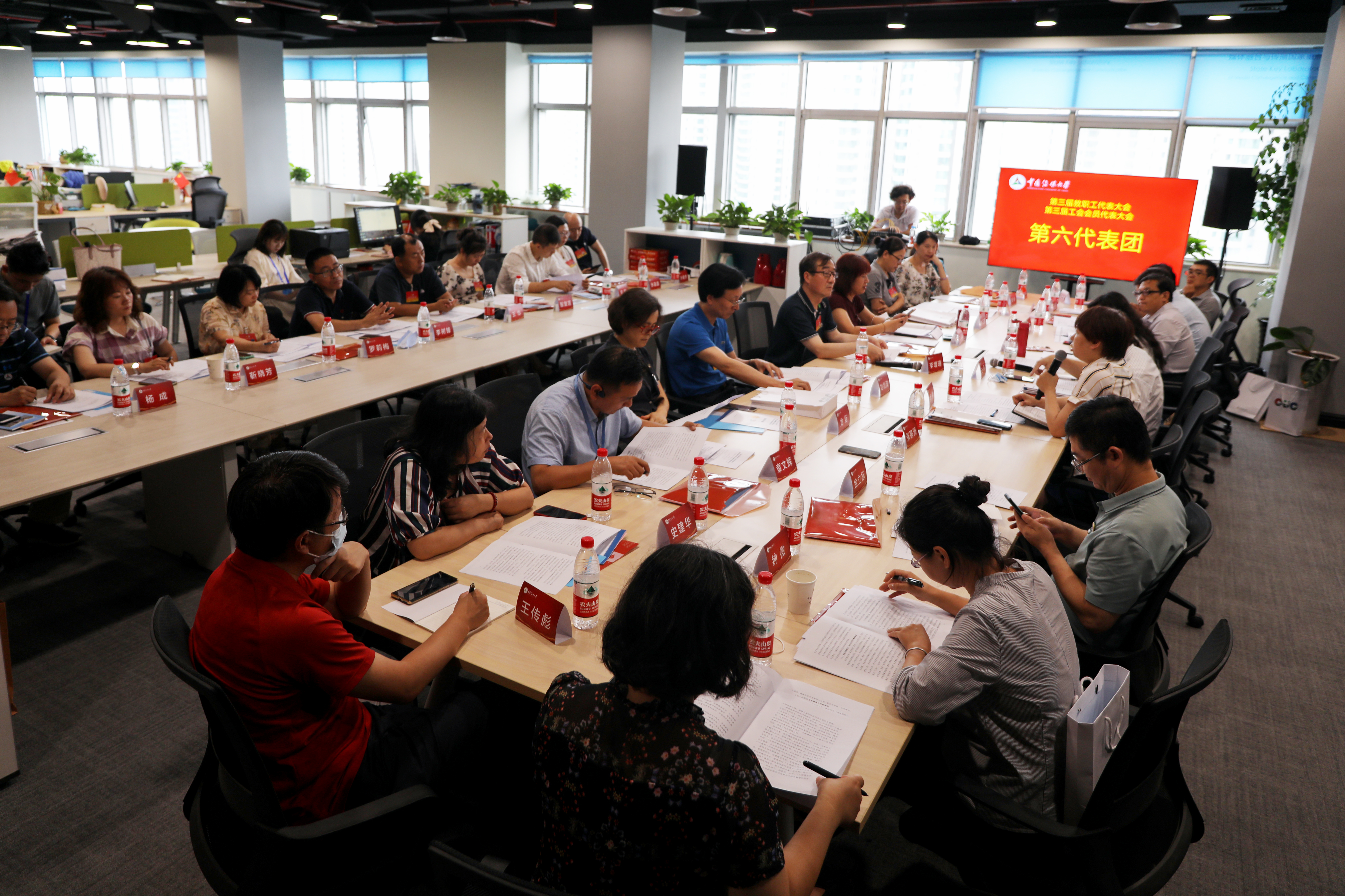 (记者 郭妍 李彦萱 摄影 王子杭)7月13日下午,第六代表团在国重大楼11层北区会议室举行分团讨论,认真审议党委书记、校长廖祥忠所作的学校工作报告和党委常委、副校长刘守训所作的第二届教代会、第二届工代会工作报告等,审议第三届教职工代表大会决议(草案)和第三届工会会员代表大会决议(草案),酝酿并讨论委员候选人建议名单,酝酿提交提案。王晖副校长参加讨论,会议由侯隽团长、钟丹丹副团长主持。