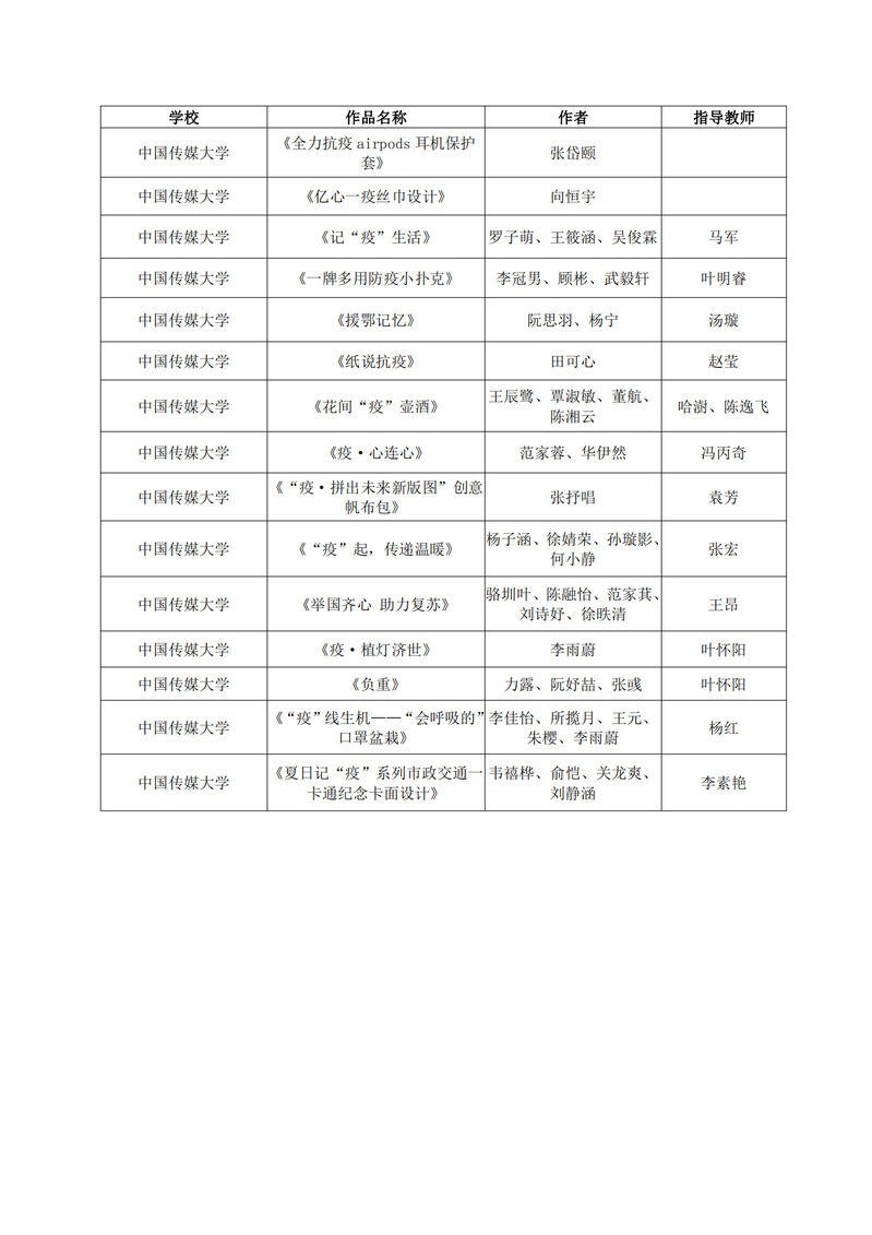 2020年2月以来,中国传媒大学以全民抗“疫”为生动题材加强课程思政建设、开展专业实践活动,创作了一批优秀作品。自北京市文创设计大赛作品征集以来,在学校教务处积极推动下,各学院积极组织学生参赛,最终推选出37部作品参加北京市级比赛。
