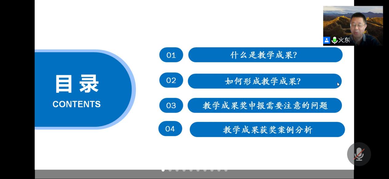(通讯员 付李琢)为进一步落实学校本科教育大会精神,提升教师对教学问题的研究意识与水平,也为即将启动的国家级、北京市教学成果奖评选做准备,8月23日,教务处特邀北京教育科学研究院高等教育研究所张炼研究员,围绕“教育教学成果的形成与凝练”主题,面向全校教师进行线上讲座。