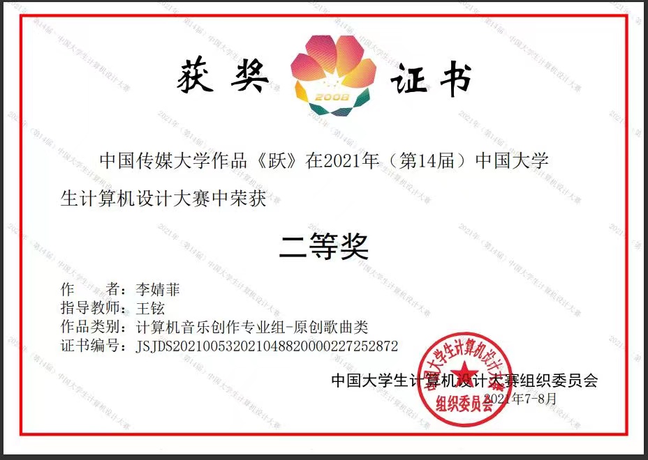 我校代表队由音乐与录音艺术学院音乐系系主任兼指导老师王铉老师带队参赛,参赛同学来自我校音乐与录音艺术学院作曲与作曲技术理论(电子音乐方向)专业。经过紧张答辩,2019级姚岫荃的作品《踏鞠图》获得计算机音乐创作专业组(原创歌曲类)一等奖,2020级周行卓的作品《即行》获得计算机音乐创作专业组(原创音乐组)一等奖,2018级毕崇闳的作品《北京之夜》获得计算机音乐创作专业组(原创音乐组)二等奖,2019级李婧菲的作品《跃》获得计算机音乐创作专业组(原创歌曲类)二等奖。