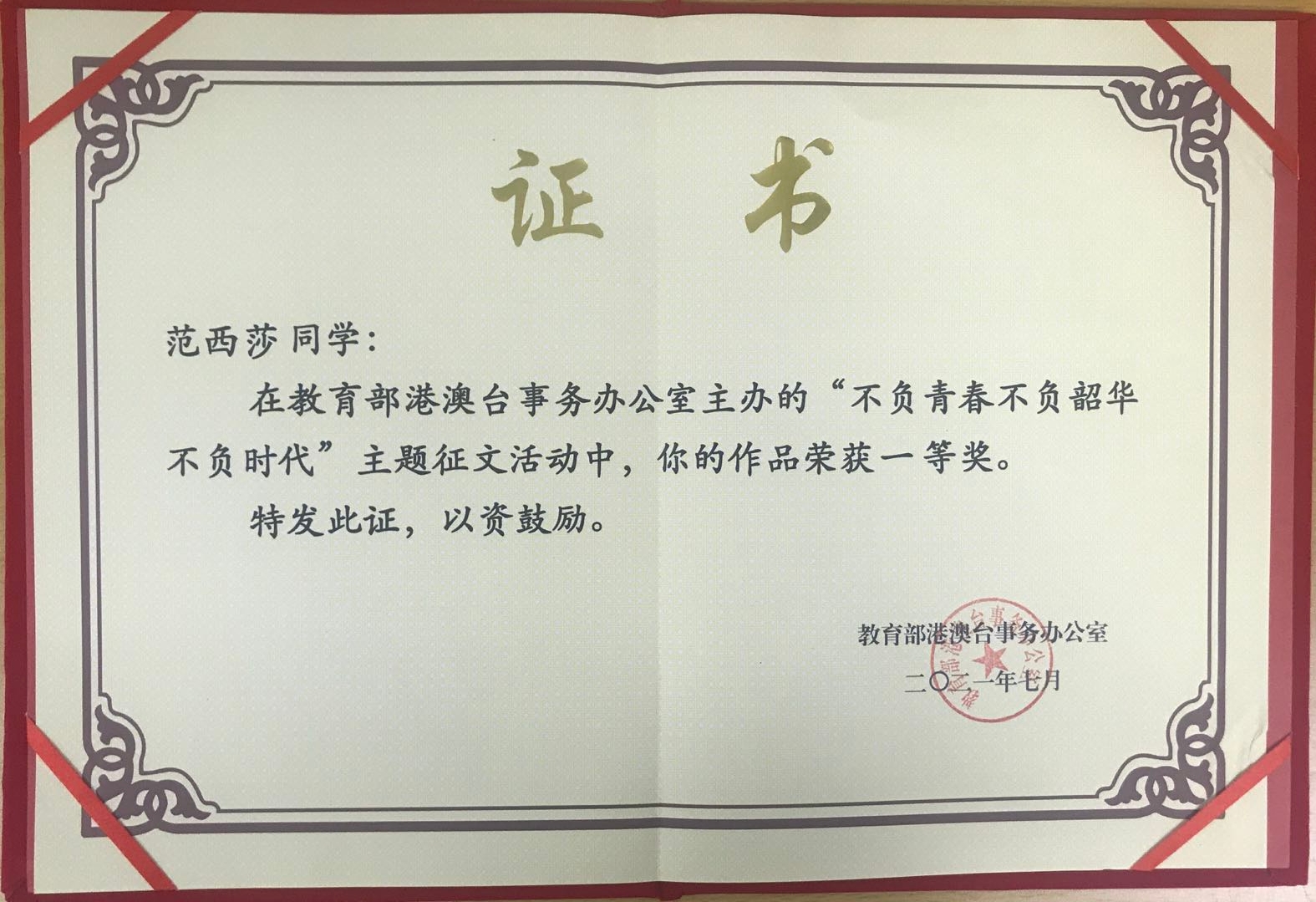 (通讯员 王昕)近日,我校在教育部港澳台事务办公室主办的“不负青春不负韶华不负时代”港澳台学生主题征文活动中荣获优秀组织奖,文化产业管理学院2020级香港籍本科生范西莎同学荣获一等奖。
