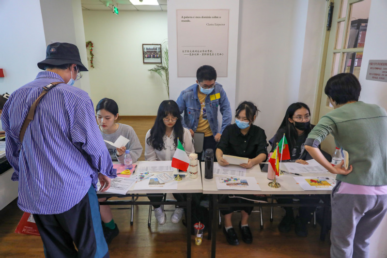 在外国语言文化学院迎新现场,24面国旗迎风招展,打造了“小联合国”般的氛围,楼内大屏幕播放着由学院出品的多语种版校歌,尽显学院“国际范儿”。