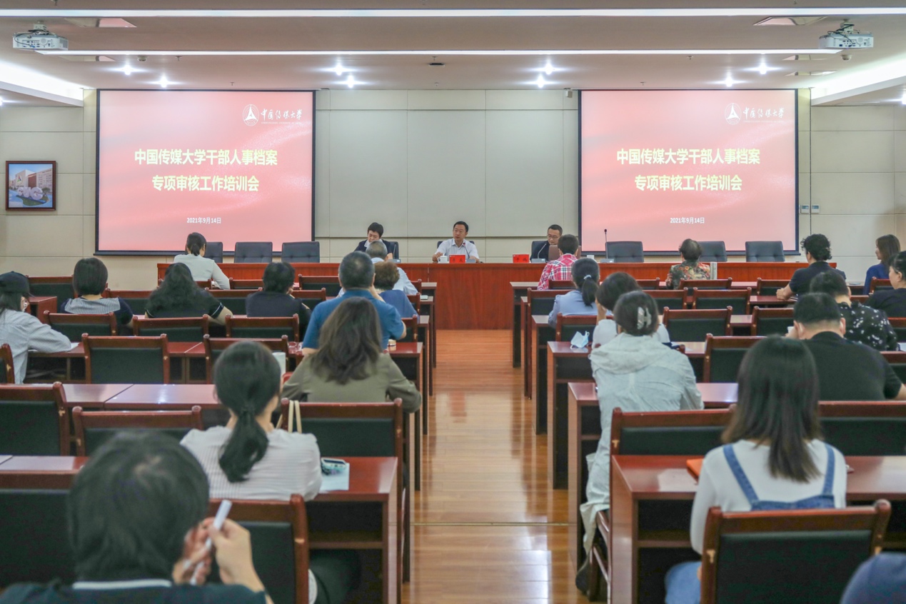 (通讯员 张师迅 摄影 王雷亭)9月14日上午,中国传媒大学干部人事档案专项审核工作培训会在学校明德报告厅召开。本次培训会由党委组织部组织筹办并开展,邀请教育部选人用人专项检查组副组长、东北林业大学党委组织部副部长于鹏同志赴我校开展培训。中国传媒大学党委副书记李众出席培训会,各基层党委、党总支、直属党支部书记,各职能部门主要负责人,各部门、各单位档案专审工作联络员,档案审核组工作人员参加会议。会议由学校人事处处长曹坤主持。